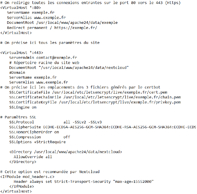 Ne reste ensuite plus qu’à créer 2 Virtual Hosts (soit directement dans Httpd.conf, soit dans le fichier « httpd-vhosts.conf » dans le répertoire /usr/local/etc/apache24/extras qui aura été copié dans le répertoire /usr/local/etc/apache24/Includes. Ces deux virtual hosts indiquent à Apache quoi répondre lorsqu’il reçoit une requête sur le port 80 ou 443.