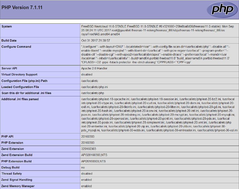 Créer un fichier info.php dans le répertoire suivant : /usr/local/www/apache24/data/nextcloud/info.php et y ajouter simplement ce petit bout de code :